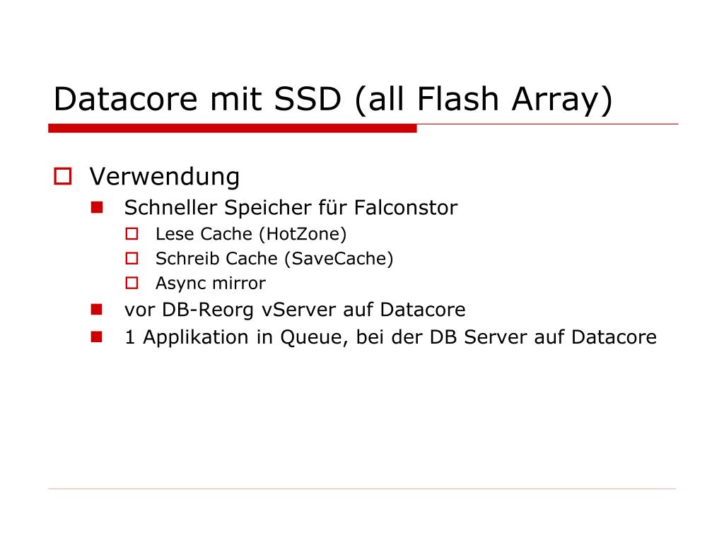Datacore mit SSD (all Flash Array) • Verwendung • Schneller Speicher für Falconstor • Lese Cache (HotZone) • Schreib Cache (SaveCache) • Asyncmirror • vor DB-Reorg vServer auf Datacore • 1 Applikation in Queue, bei der DB Server auf Datacore