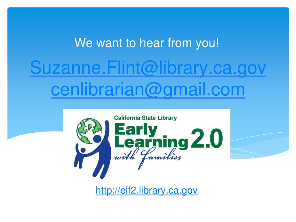 We want to hear from you! Suzanne.Flint@library.ca.gov cenlibrarian@gmail.com http://elf2.library.ca.gov