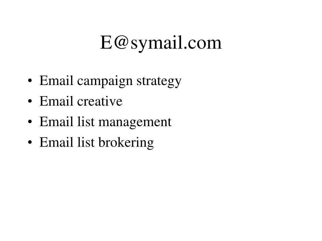 E@symail.com • Email campaign strategy • Email creative • Email list management • Email list brokering