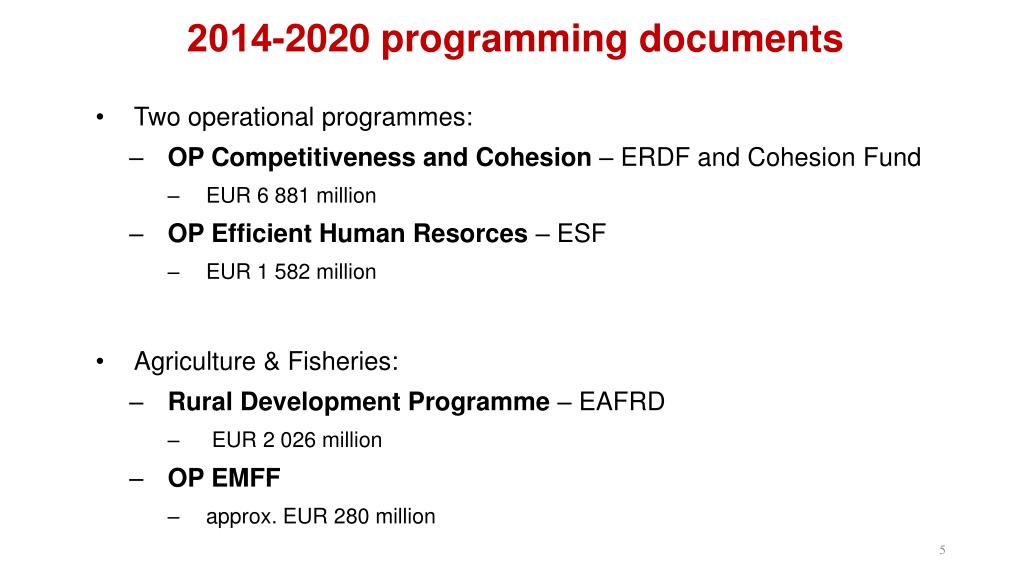 2014-2020 programming documents • Two operational programmes: • OP Competitiveness and Cohesion – ERDF and Cohesion Fund • EUR 6 881 million • OP Efficient Human Resorces – ESF • EUR 1 582 million • Agriculture & Fisheries: • Rural Development Programme – EAFRD • EUR 2 026 million • OP EMFF • approx. EUR 280 million