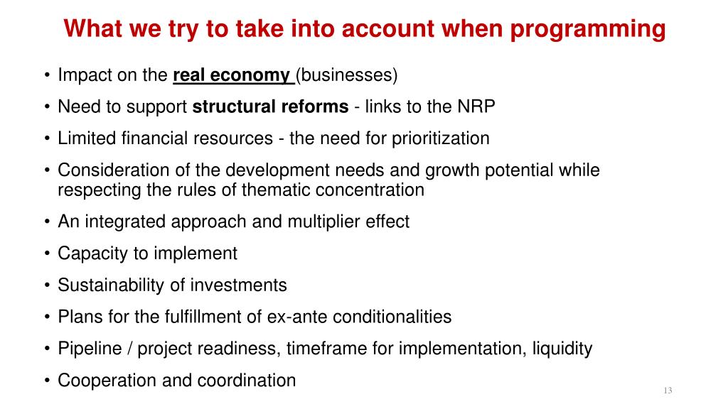 What we try to take into account when programming • Impact on the real economy(businesses) • Need to support structural reforms - linksto theNRP • Limited financial resources - the need for prioritization • Consideration of the development needs and growth potential while respecting the rules of thematic concentration • An integrated approach and multiplier effect • Capacity to implement • Sustainability of investments • Plans for the fulfillment of ex-ante conditionalities • Pipeline / project readiness, timeframe for implementation, liquidity • Cooperation and coordination