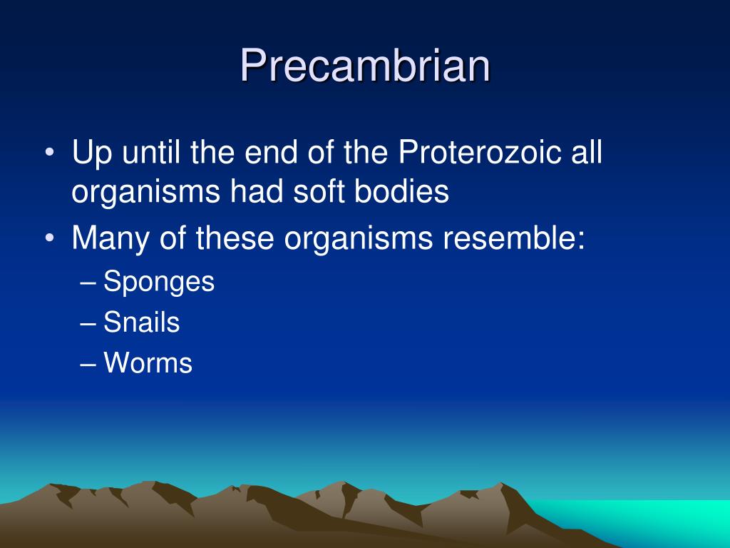 Precambrian • Up until the end of the Proterozoic all organisms had soft bodies • Many of these organisms resemble: • Sponges • Snails • Worms