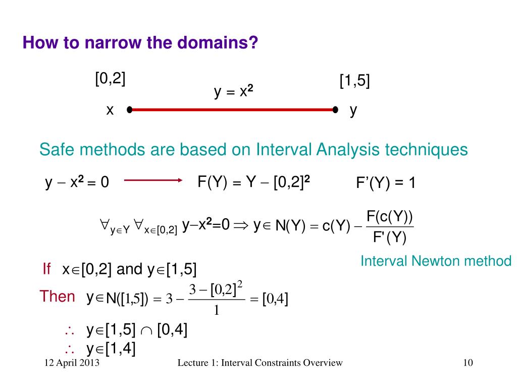 [0,max(a2,b2)] ifa0b [0,2] [1,5] x[a,b]x2[a,b]2= y = x2 [min(a2,b2),max(a2,b2)] otherwise x y NFy=x²: Y’ YX2 How to narrow the domains? Safe methods are based on Interval Analysis techniques Lecture 1: Interval Constraints Overview