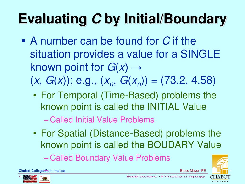 Evaluating C by Initial/Boundary • A number can be found for C if the situation provides a value for a SINGLE known point for G(x) → (x, G(x)); e.g., (xn, G(xn)) = (73.2, 4.58) • For Temporal (Time-Based) problems the known point is called the INITIAL Value • Called Initial Value Problems • For Spatial (Distance-Based) problems the known point is called the BOUDARY Value • Called Boundary Value Problems