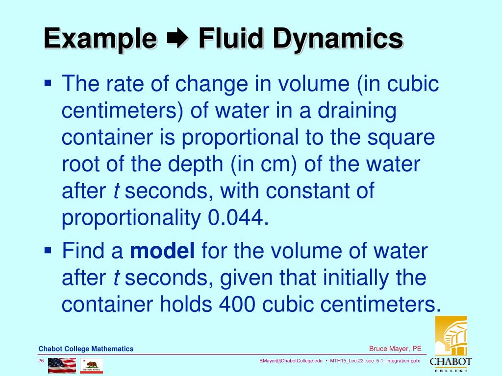 Example Fluid Dynamics • The rate of change in volume (in cubic centimeters) of water in a draining container is proportional to the square root of the depth (in cm) of the water after t seconds, with constant of proportionality 0.044. • Find a model for the volume of water after t seconds, given that initially the container holds 400 cubic centimeters.