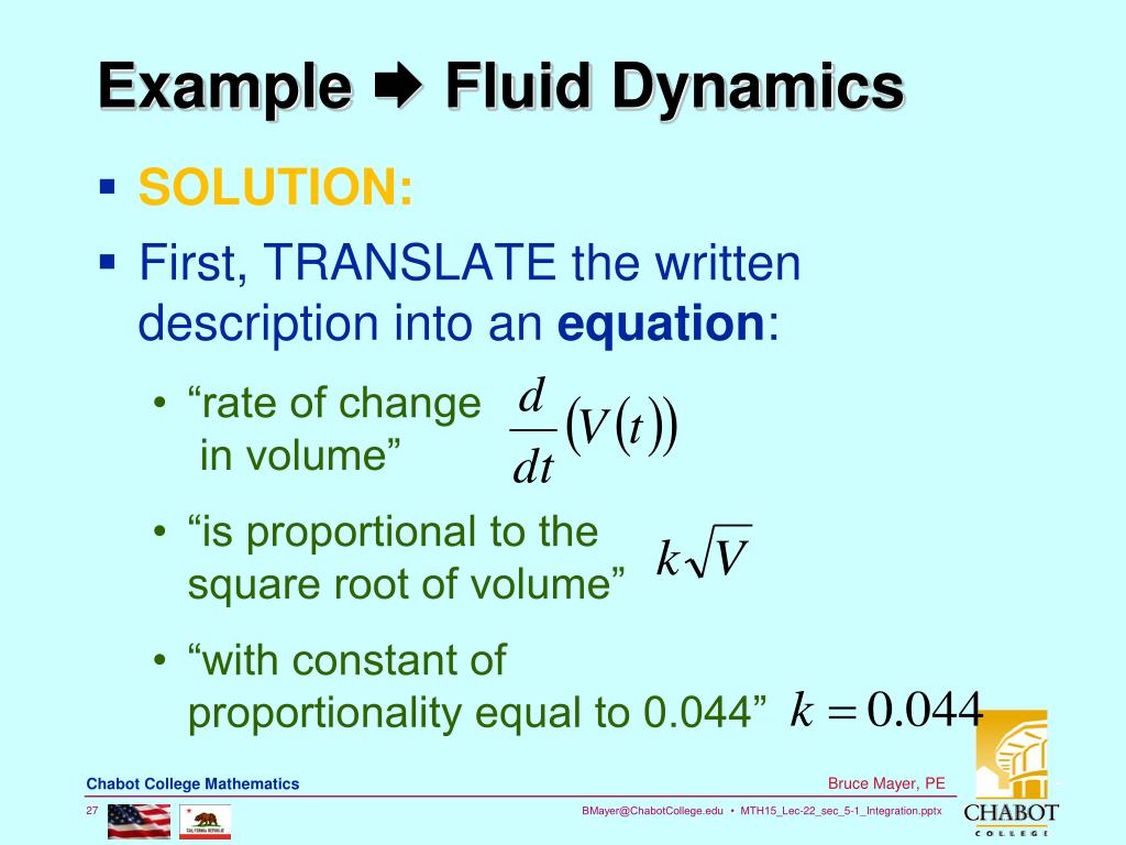 Example Fluid Dynamics • SOLUTION: • First, TRANSLATE the written description into an equation: • “rate of change in volume” • “is proportional to thesquare root of volume” • “with constant of proportionality equal to 0.044”