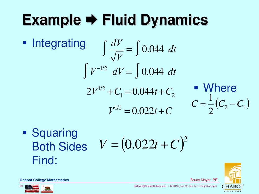 Example Fluid Dynamics • Integrating • Where • SquaringBoth SidesFind: