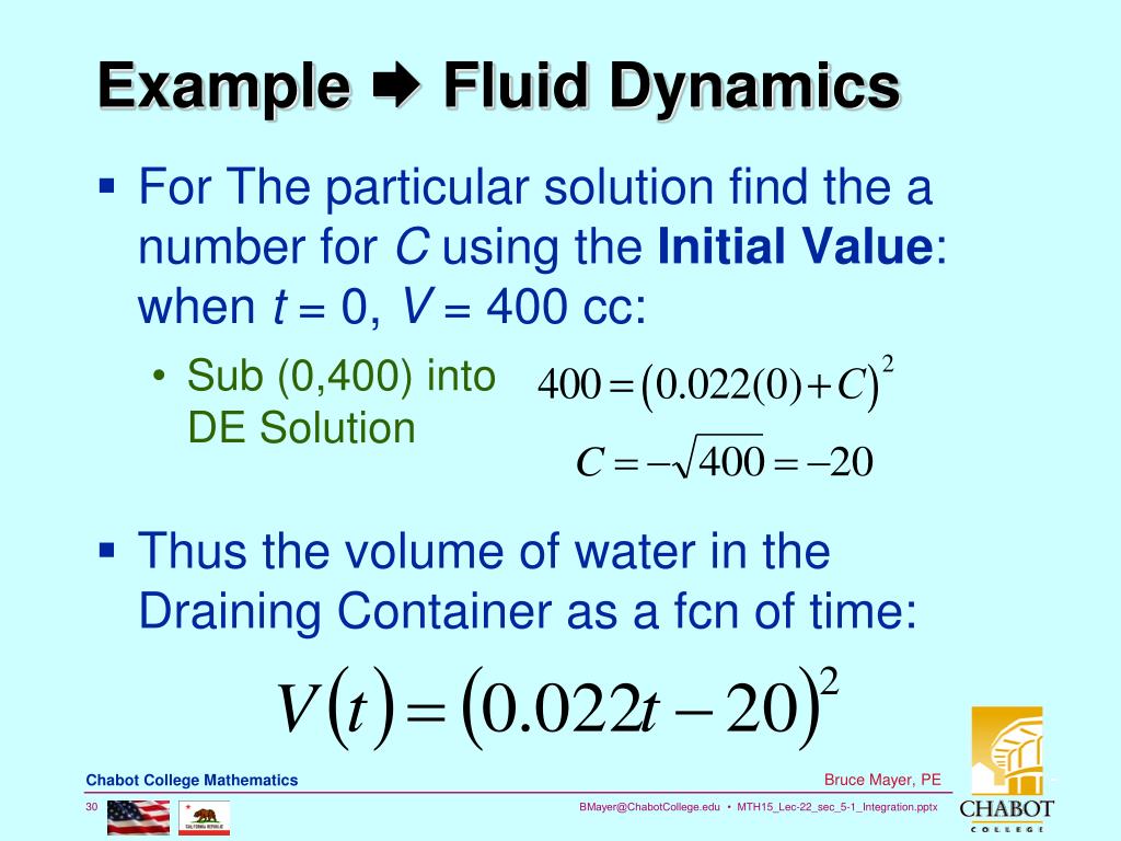 Example Fluid Dynamics • For The particular solution find the a number for C using the Initial Value: when t = 0, V = 400 cc: • Sub (0,400) into DE Solution • Thus the volume of water in the Draining Container as a fcn of time: