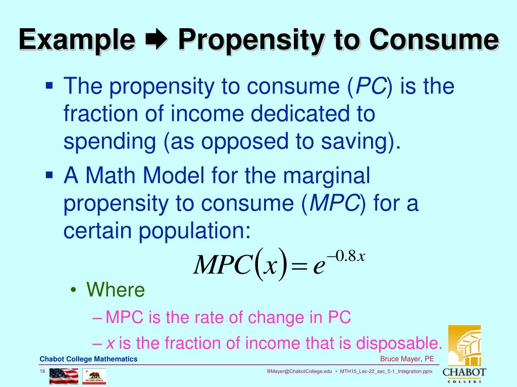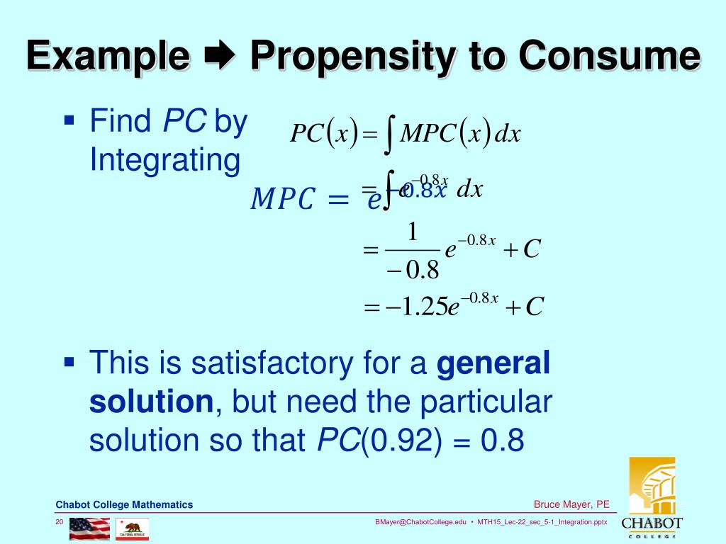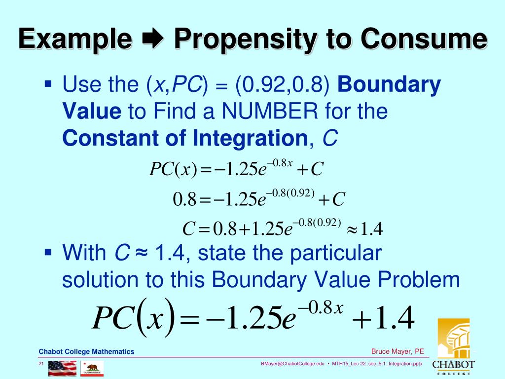 Example Propensity to Consume • Use the (x,PC) = (0.92,0.8) Boundary Value to Find a NUMBER for the Constant of Integration, C • With C ≈ 1.4, state the particular solution to this Boundary Value Problem