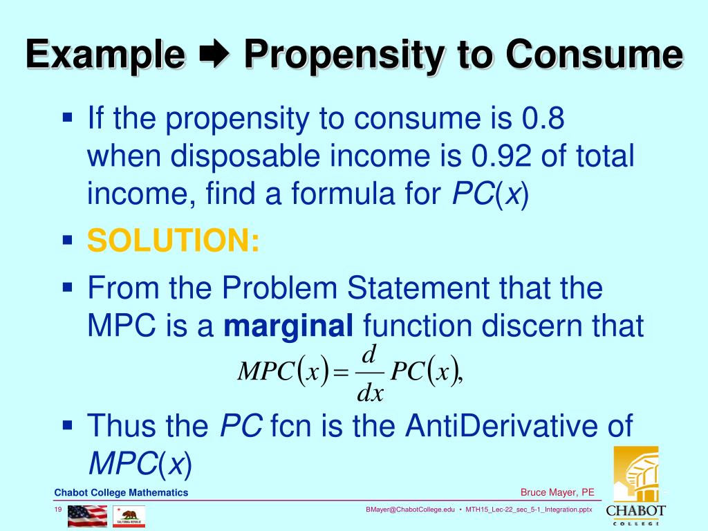 Example Propensity to Consume • If the propensity to consume is 0.8 when disposable income is 0.92 of total income, find a formula for PC(x) • SOLUTION: • From the Problem Statement that the MPC is a marginal function discern that • Thus the PCfcn is the AntiDerivative of MPC(x)