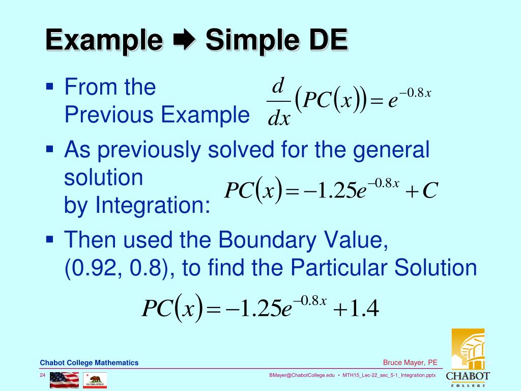 Example Simple DE • From the Previous Example • As previously solved for the general solution by Integration: • Then used the Boundary Value, (0.92, 0.8), to find the Particular Solution
