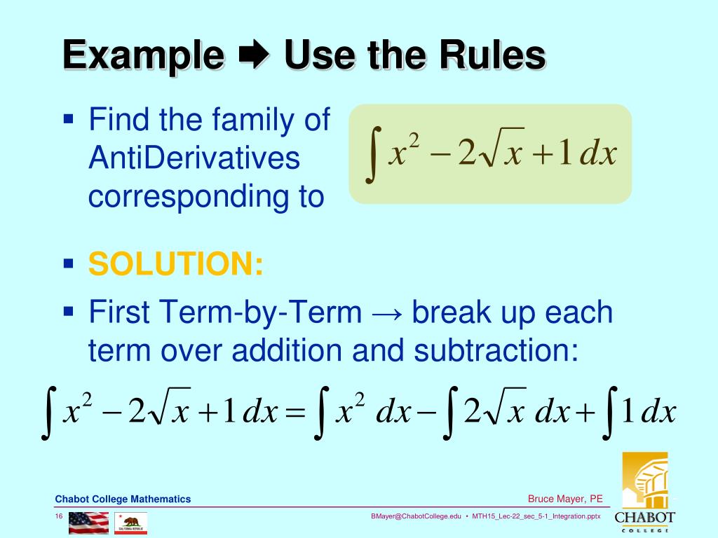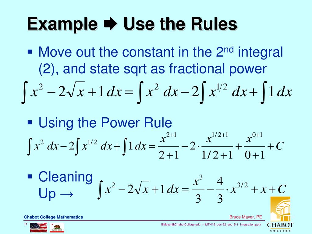 Example Use the Rules • Move out the constant in the 2nd integral (2), and state sqrt as fractional power • Using the Power Rule • CleaningUp →