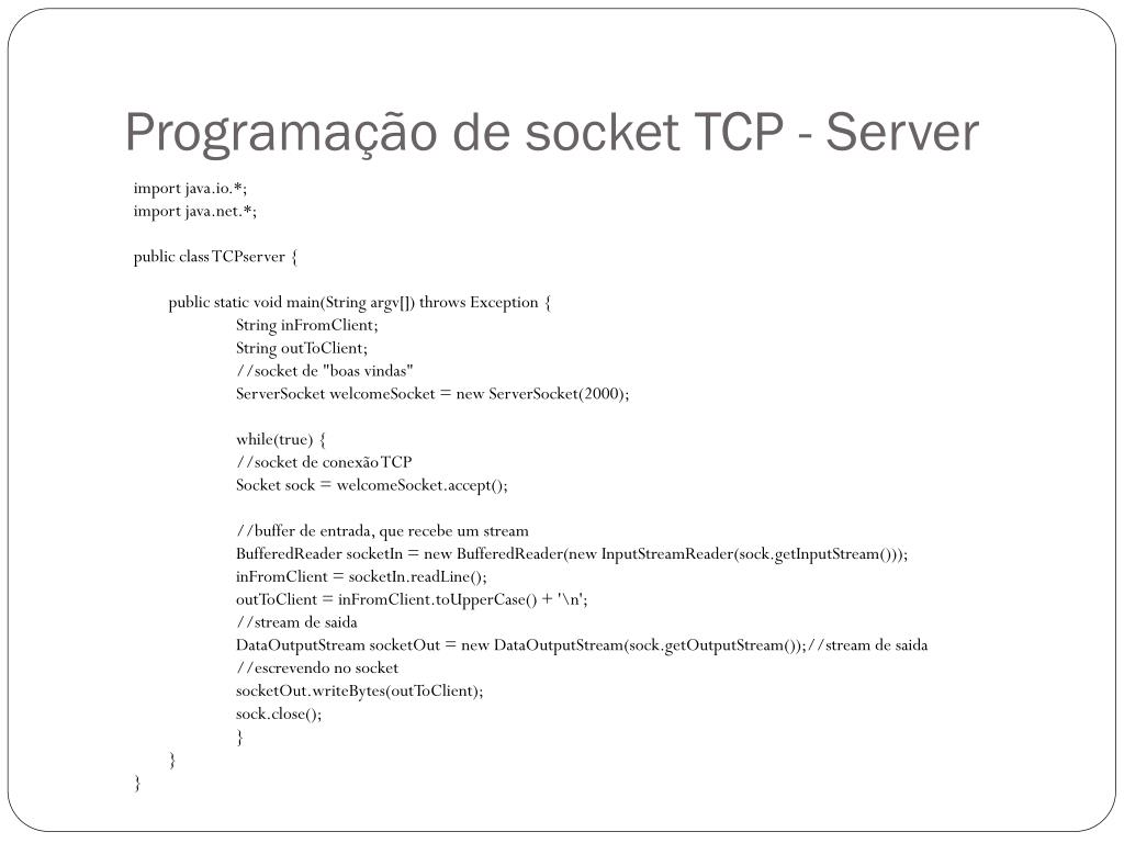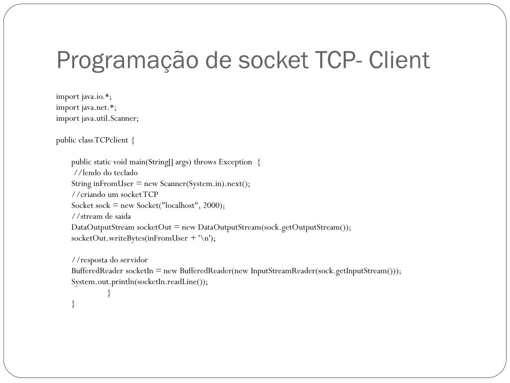 Programação de socket TCP- Client importjava.io.*; importjava.net.*; importjava.util.Scanner; publicclassTCPclient { publicstaticvoidmain(String[] args) throws Exception { //lendo do teclado String inFromUser = new Scanner(System.in).next(); //criando um socket TCP Socketsock = newSocket("localhost", 2000); //stream de saida DataOutputStreamsocketOut = newDataOutputStream(sock.getOutputStream()); socketOut.writeBytes(inFromUser + '\n'); //resposta do servidor BufferedReadersocketIn = newBufferedReader(newInputStreamReader(sock.getInputStream())); System.out.println(socketIn.readLine()); } }
