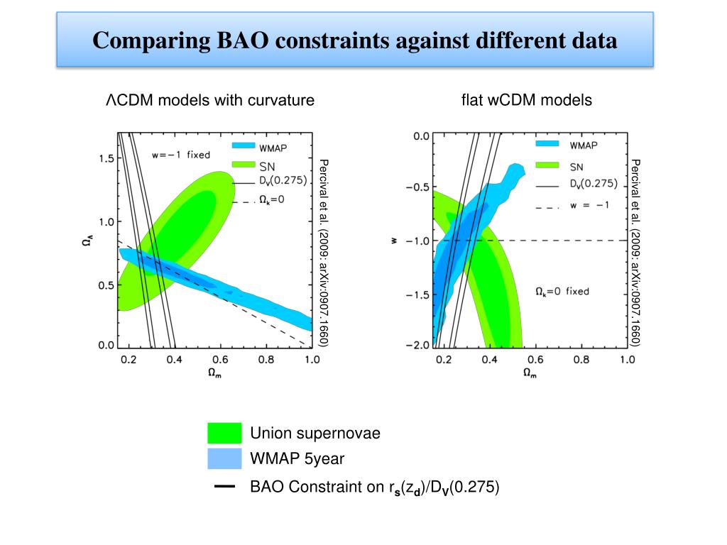 Comparing BAO constraints against different data flat wCDM models ΛCDM models with curvature Percival et al. (2009: arXiv:0907.1660) Percival et al. (2009: arXiv:0907.1660) Union supernovae WMAP 5year BAO Constraint on rs(zd)/DV(0.275)