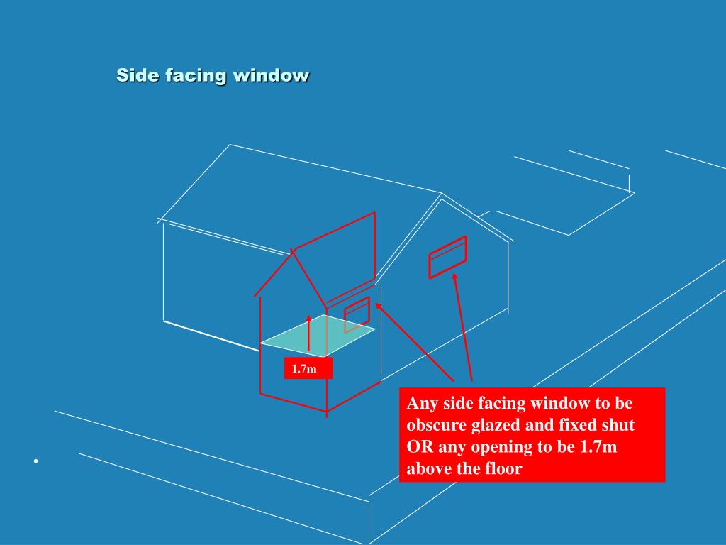 Side facing window 1.7m Any side facing window to be obscure glazed and fixed shut OR any opening to be 1.7m above the floor .