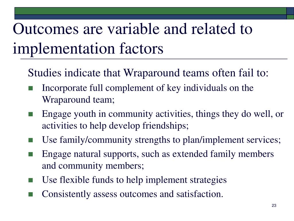 Outcomes are variable and related to implementation factors Studies indicate that Wraparound teams often fail to: • Incorporate full complement of key individuals on the Wraparound team; • Engage youth in community activities, things they do well, or activities to help develop friendships; • Use family/community strengths to plan/implement services; • Engage natural supports, such as extended family members and community members; • Use flexible funds to help implement strategies • Consistently assess outcomes and satisfaction.