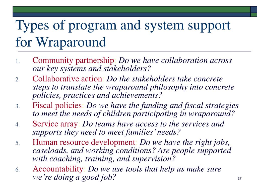 Types of program and system support for Wraparound • Community partnership:Do we have collaboration across our key systems and stakeholders? • Collaborative action:Do the stakeholders take concrete steps to translate the wraparound philosophy into concrete policies, practices and achievements? • Fiscal policies:Do we have the funding and fiscal strategies to meet the needs of children participating in wraparound? • Service array:Do teams have access to the services and supports they need to meet families’ needs? • Human resource development:Do we have the right jobs, caseloads, and working conditions? Are people supported with coaching, training, and supervision? • Accountability:Do we use tools that help us make sure we’re doing a good job?