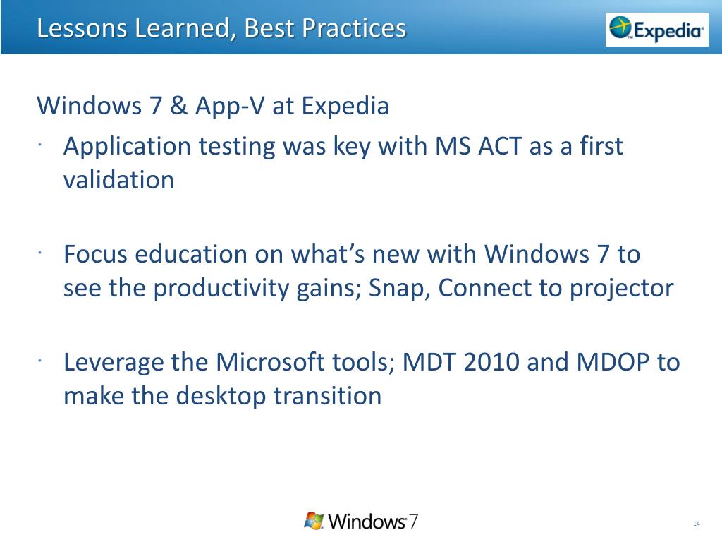 Lessons Learned, Best Practices Windows 7 & App-V at Expedia • Application testing was key with MS ACT as a first validation • Focus education on what’s new with Windows 7 to see the productivity gains; Snap, Connect to projector • Leverage the Microsoft tools; MDT 2010 and MDOP to make the desktop transition