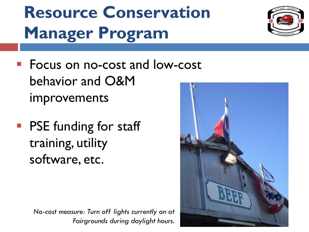 Resource Conservation Manager Program • Focus on no-cost and low-cost behavior and O&M improvements • PSE funding for staff position, training, utility tracking software, etc. No-cost measure: Turn off lights currently on at Fairgrounds during daylight hours.