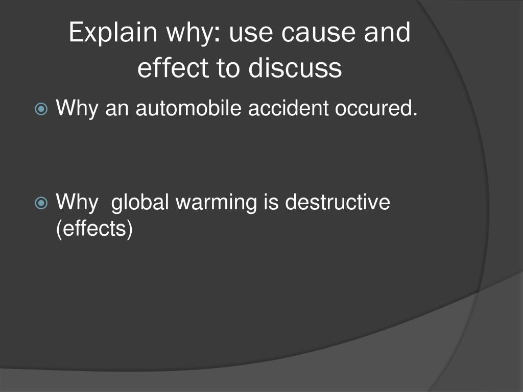 Explainwhy: use cause and effecttodiscuss • Whyanautomobileaccidentoccured. • Why global warmingisdestructive (effects)