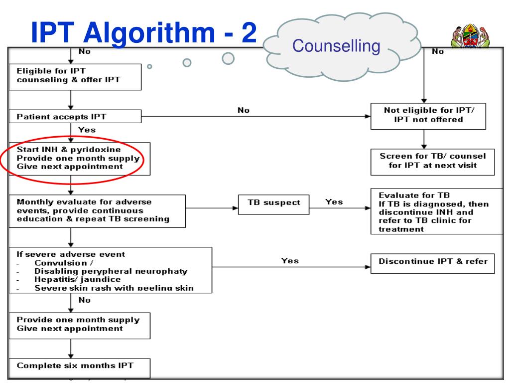 Prescribing IPT • Write down the dose and duration of INH • Dose: 300 mg daily • If patient weighs <30 kg: dose 5 mg/kg • Duration: 6 months • Pyridoxine • Dose: 25 mg daily • Duration: 6 months