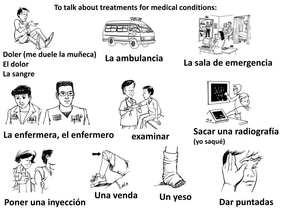 To talk about treatments for medical conditions: Doler (me duelela muñeca) El dolor La sangre La ambulancia La sala de emergencia Sacarunaradiografía (yosaqué) La enfermera, el enfermero examinar Unavenda Un yeso Dar puntadas Ponerunainyección