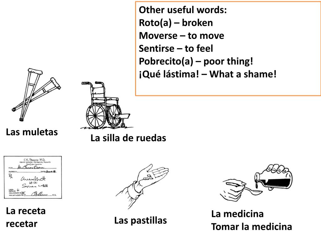 Other useful words: Roto(a) – broken Moverse – to move Sentirse – to feel Pobrecito(a) – poor thing! ¡Quélástima! – What a shame! Las muletas La silla de ruedas La receta recetar La medicina Tomar la medicina Las pastillas