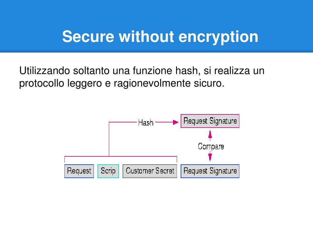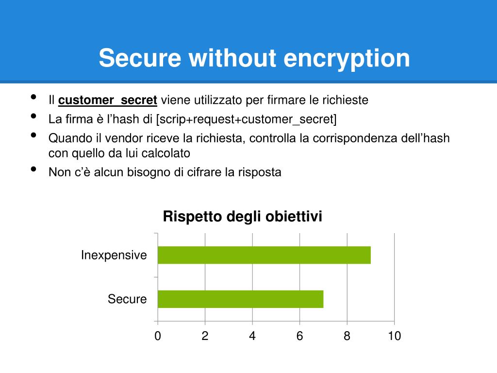 Secure without encryption • Il customer_secret viene utilizzato per firmare le richieste • La firma è l’hash di [scrip+request+customer_secret] • Quando il vendor riceve la richiesta, controlla la corrispondenza dell’hash con quello da lui calcolato • Non c’è alcun bisogno di cifrare la risposta