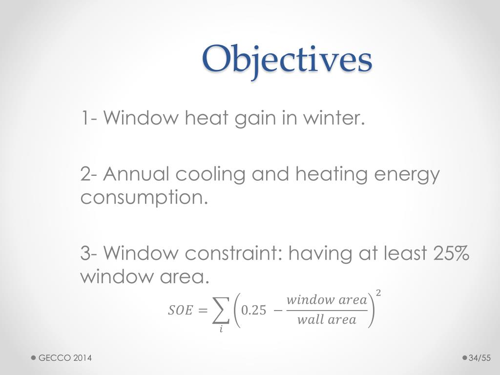 Objectives 1- Window heat gain in winter. 2- Annual cooling and heating energy consumption. 3- Window constraint: having at least 25% window area. GECCO 2014