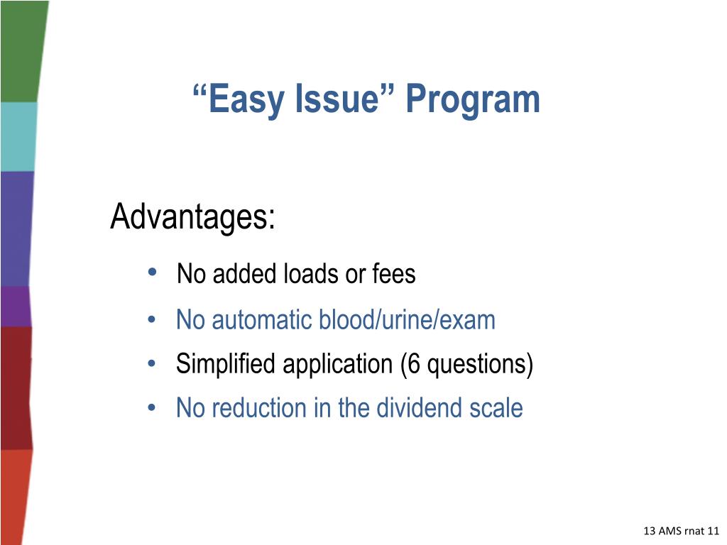 “Easy Issue” Program Advantages: • No added loads or fees • No automatic blood/urine/exam • Simplified application (6 questions) • No reduction in the dividend scale