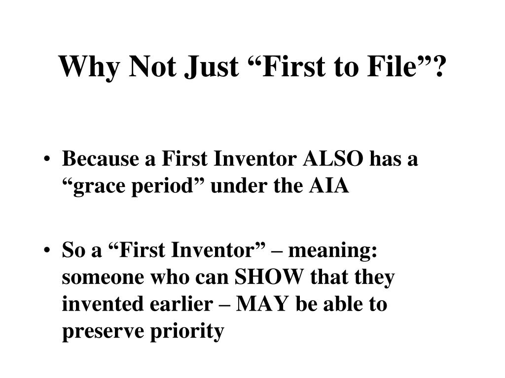 Why Not Just “First to File”? • Because a First Inventor ALSO has a “grace period” under the AIA • So a “First Inventor” – meaning: someone who can SHOW that they invented earlier – MAY be able to preserve priority