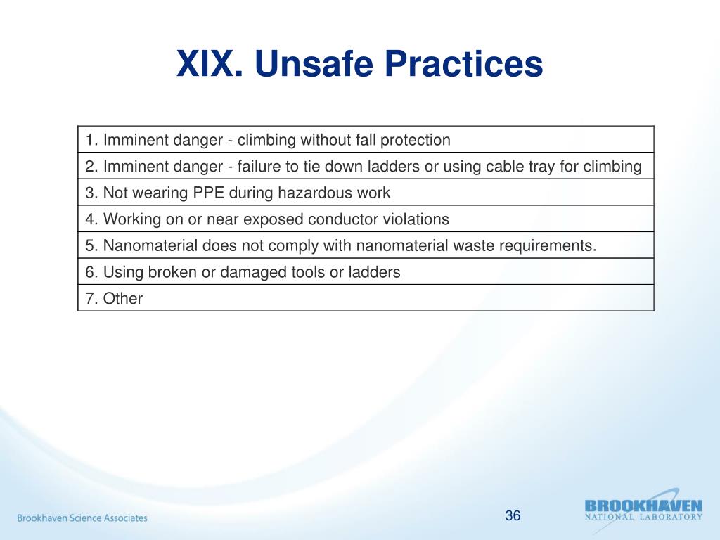 Findings Reported Under Unsafe Practices • IO: Finding: A room in the basement that had no windows and no way of indicating if anyone was working inside while the door was closed. Resolution: Placed a sign stating that no work should be done in the room while the door was closed. • ITD: Finding: A wooden ladder in very poor condition and still in service was located in the basement. Resolution: Threw out the ladder. • Chemistry (Per D. Cabelli, these are unsafe issues, and not necessarily unsafe practices.) Q3 Findings: Step stools needs new rubber feet. Remove or post area in back by mat – trip hazard Resolution: All of the stepstools were fixed for the following Tier I. Q4 findings: Remove or post area in back by mat – Trip hazard. Heavy items on top shelf. Lead on wooden counter in vault is too heavy; should be removed or supported.