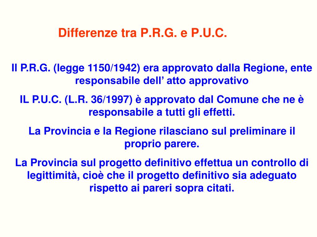 Differenze tra P.R.G. e P.U.C. Il P.R.G. (legge 1150/1942) era approvato dalla Regione, ente responsabile dell’ atto approvativo IL P.U.C. (L.R. 36/1997) è approvato dal Comune che ne è responsabile a tutti gli effetti. La Provincia e la Regione rilasciano sul preliminare il proprio parere. La Provincia sul progetto definitivo effettua un controllo di legittimità, cioè che il progetto definitivo sia adeguato rispetto ai pareri sopra citati.