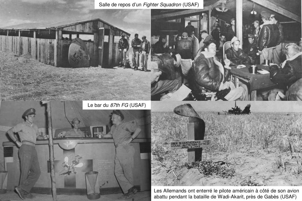 Salle de repos d’un Fighter Squadron (USAF) Le bar du 87thFG (USAF) Les Allemands ont enterré le pilote américain à côté de son avion abattu pendant la bataille de Wadi-Akarit, près de Gabès (USAF)