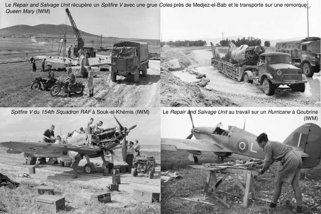 Le Repair and Salvage Unit récupère un SpitfireV avec une grue Coles près de Medjez-el-Bab et le transporte sur une remorque Queen Mary (IWM) SpitfireV du 154th Squadron RAF à Souk-el-Khémis (IWM) Le Repair and Salvage Unit au travail sur un Hurricane à Goubrine (IWM)