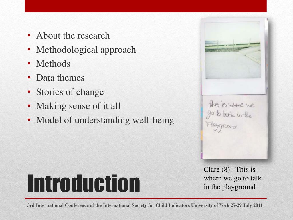 About the research • Methodological approach • Methods • Data themes • Stories of change • Making sense of it all • Model of understanding well-being Introduction Clare (8): This is where we go to talk in the playground 3rd International Conference of the International Society for Child Indicators University of York 27-29 July 2011