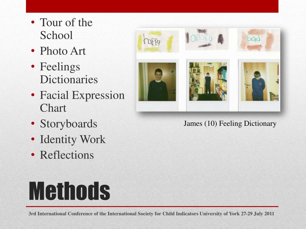 Tour of the School • Photo Art • Feelings Dictionaries • Facial Expression Chart • Storyboards • Identity Work • Reflections James (10) Feeling Dictionary Methods 3rd International Conference of the International Society for Child Indicators University of York 27-29 July 2011