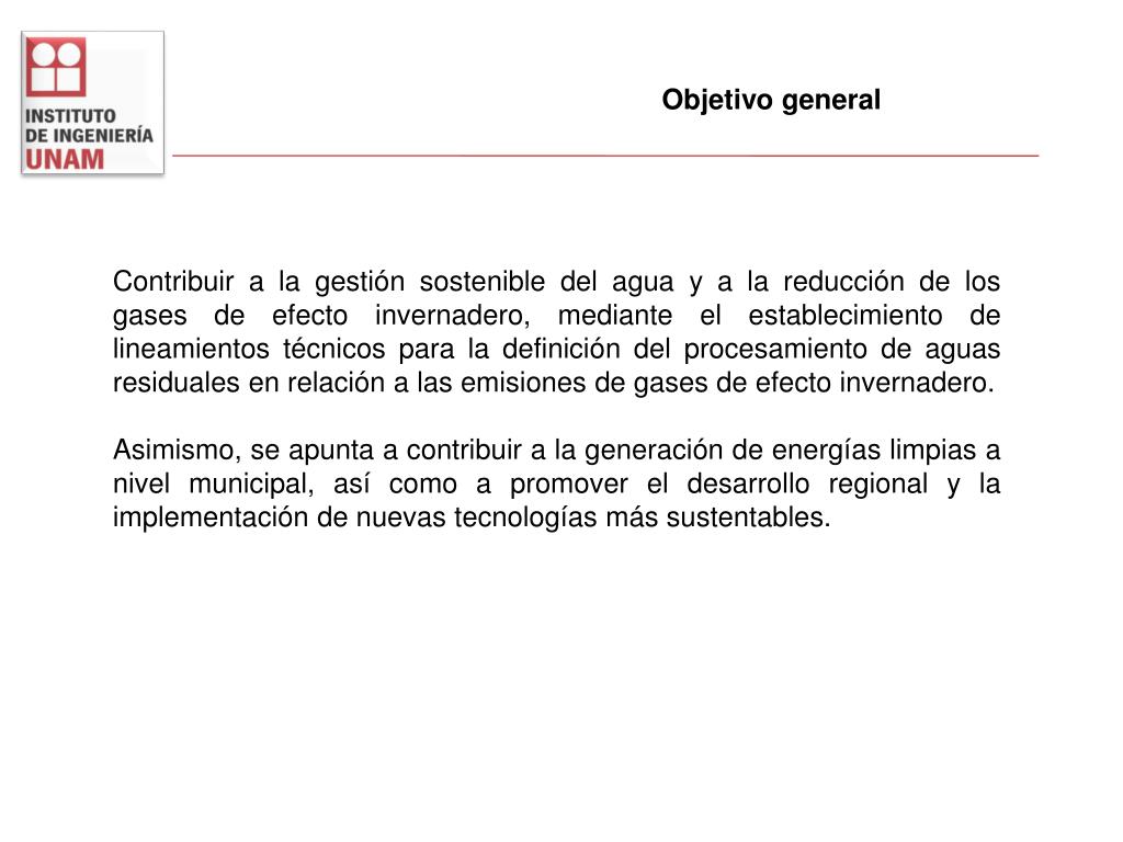 Objetivo general Contribuir a la gestión sostenible del agua y a la reducción de los gases de efecto invernadero, mediante el establecimiento de lineamientos técnicos para la definición del procesamiento de aguas residuales en relación a las emisiones de gases de efecto invernadero. Asimismo, se apunta a contribuir a la generación de energías limpias a nivel municipal, así como a promover el desarrollo regional y la implementación de nuevas tecnologías más sustentables. Dr. Adalberto Noyola Robles Dr. Juan Manuel Morgan Sagastume Dra. Patricia Güereca Hernández M. en I. Liliana Romero Casallas M. en I. Margarita Cisneros Ortiz M. en C. Alejandro Padilla Rivera