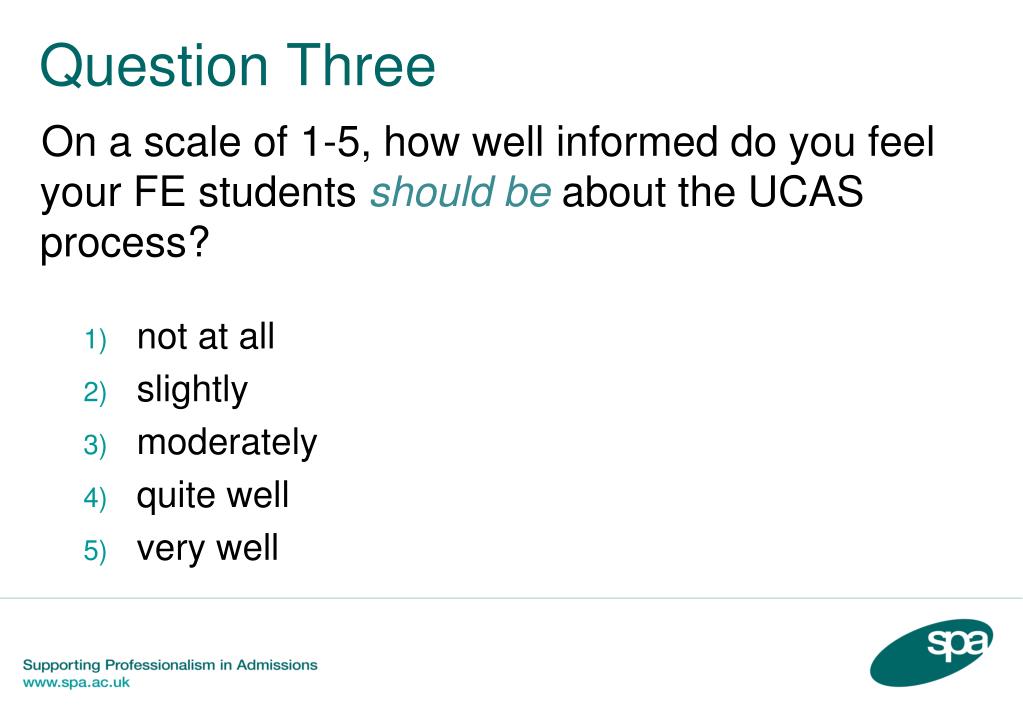 Question Three On a scale of 1-5, how well informed do you feel your FE students should be about the UCAS process? • not at all • slightly • moderately • quite well • very well