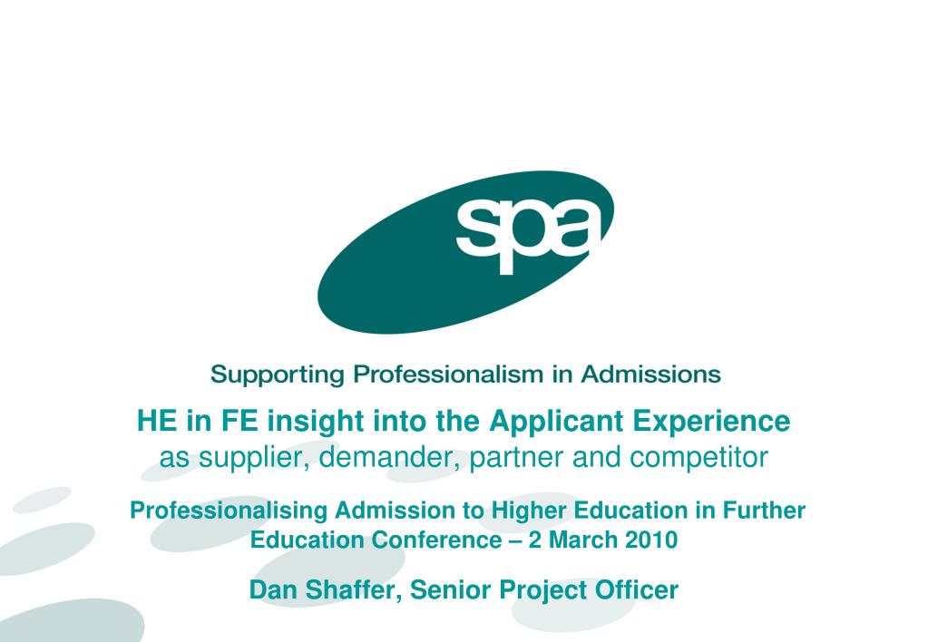HE in FE insight into the Applicant Experienceas supplier, demander, partner and competitorProfessionalising Admission to Higher Education in Further Education Conference – 2 March 2010Dan Shaffer, Senior Project Officer