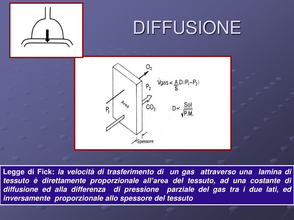 Trasferimento di CO: limitato dalla diffusioneTrasferimento di NO: limitato dalla perfusioneTrasferimento di O2: intermedio Diffusione del CO (single-breath, steady state)