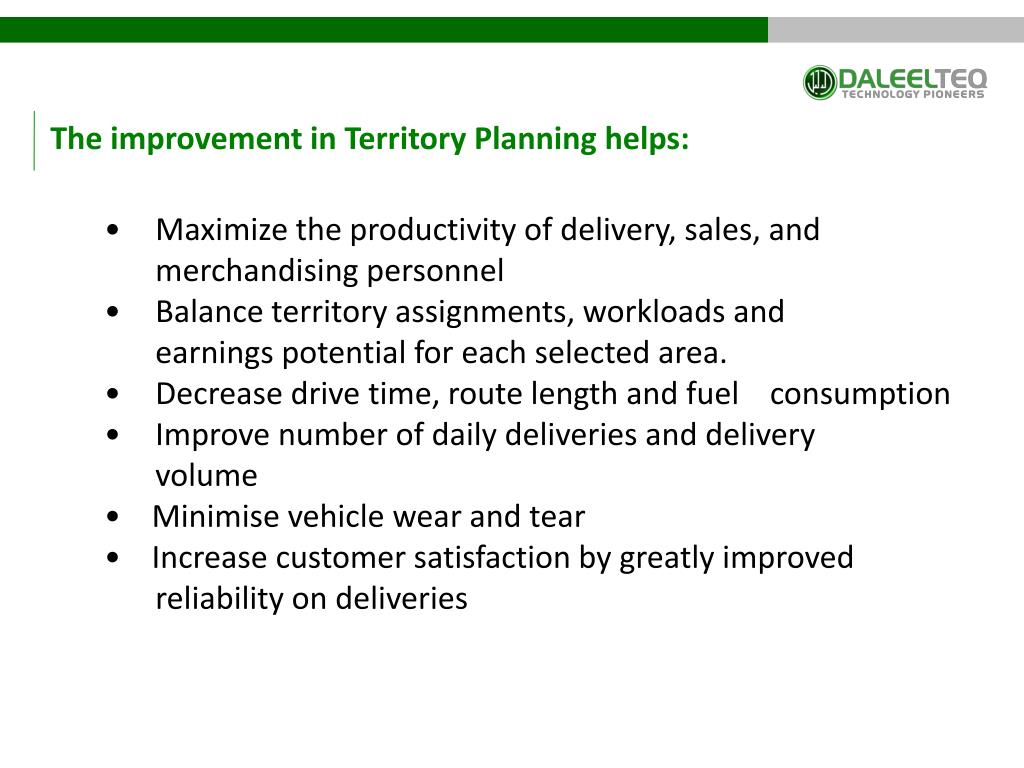 The improvement in Territory Planning helps: • Maximize the productivity of delivery, sales, and merchandising personnel • Balance territory assignments, workloads and earnings potential for each selected area. • Decrease drive time, route length and fuel consumption • Improve number of daily deliveries and delivery volume • Minimise vehicle wear and tear • Increase customer satisfaction by greatly improved reliability on deliveries