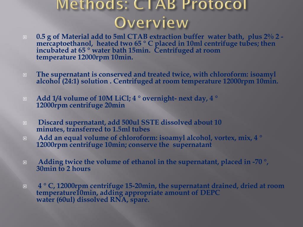Methods: CTAB Protocol Overview • 0.5 g of Material add to 5ml CTAB extraction buffer water bath, plus 2% 2 -mercaptoethanol, heated two 65 ° C placed in 10ml centrifuge tubes; then incubated at 65 ° water bath 15min. Centrifuged at room temperature 12000rpm 10min. • The supernatant is conserved and treated twice, with chloroform: isoamyl alcohol (24:1) solution . Centrifuged at room temperature 12000rpm 10min. • Add 1/4 volume of 10M LiCl; 4 ° overnight- next day, 4 ° 12000rpm centrifuge 20min • Discard supernatant, add 500ul SSTE dissolved about 10 minutes, transferred to 1.5ml tubes • Add an equal volume of chloroform: isoamyl alcohol, vortex, mix, 4 ° 12000rpm centrifuge 10min; conserve the supernatant • Adding twice the volume of ethanol in the supernatant, placed in -70 °, 30min to 2 hours • 4 ° C, 12000rpm centrifuge 15-20min, the supernatant drained, dried at room temperature10min, adding appropriate amount of DEPC water (60ul) dissolved RNA, spare.