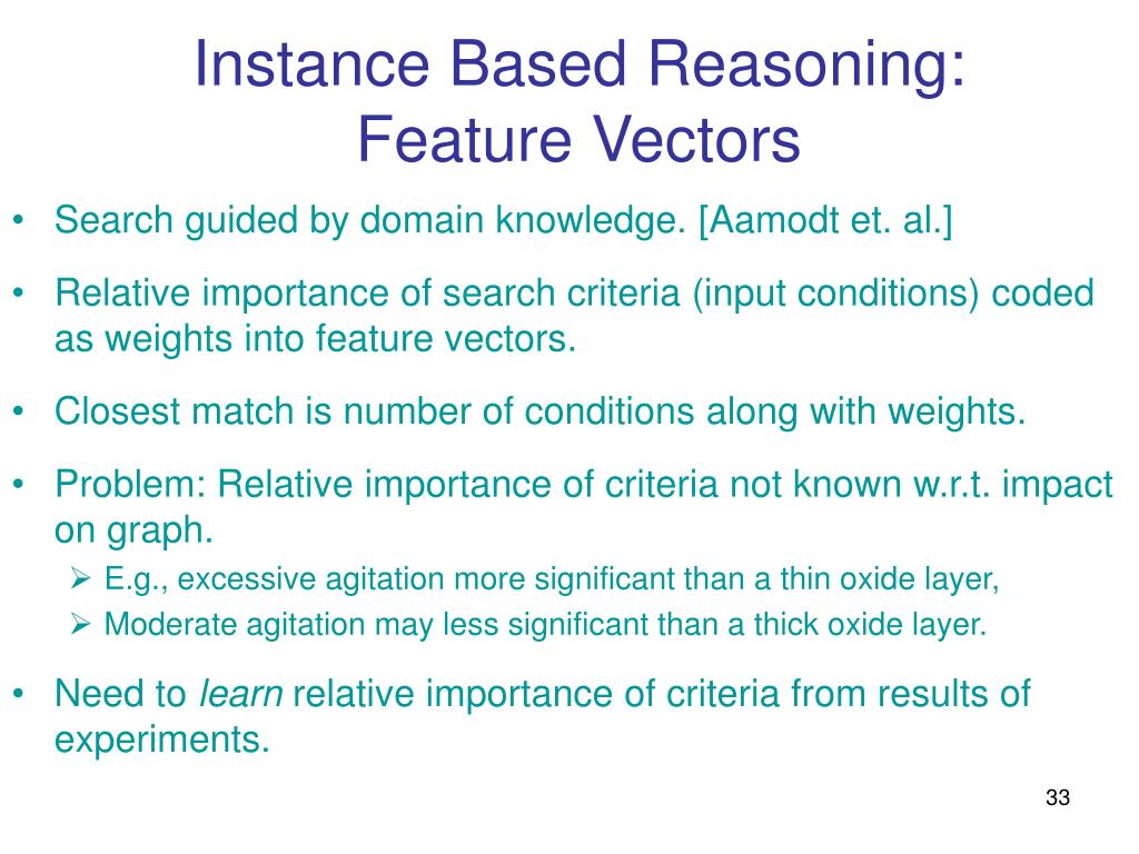 Instance Based Reasoning: Feature Vectors • Search guided by domain knowledge. [Aamodt et. al.] • Relative importance of search criteria (input conditions) coded as weights into feature vectors. • Closest match is number of conditions along with weights. • Problem: Relative importance of criteria not known w.r.t. impact on graph. • E.g., excessive agitation more significant than a thin oxide layer, • Moderate agitation may less significant than a thick oxide layer. • Need to learn relative importance of criteria from results of experiments.