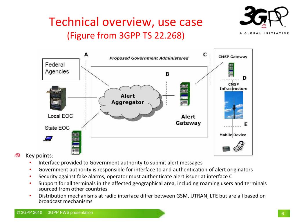 Technical overview, use case(Figure from 3GPP TS 22.268) • Key points: • Interface provided to Government authority to submit alert messages • Government authority is responsible for interface to and authentication of alert originators • Security against fake alarms, operator must authenticate alert issuer at interface C • Support for all terminals in the affected geographical area, including roaming users and terminals sourced from other countries • Distribution mechanisms at radio interface differ between GSM, UTRAN, LTE but are all based on broadcast mechanisms