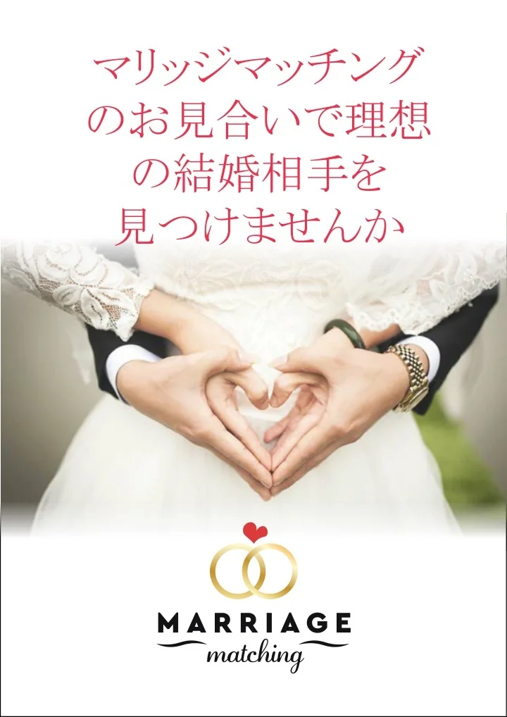 マリッジマッチングのお見合いで理想の結婚相手マリッジマッチングのお見合いで理想の結婚相手 を見つけよう 理想の結婚相手とのお見合いを希望し、会う準備が出来ているお客様には弊 社が全力でサポート致します。 マリッジマッチングでは会員の方はいつでもサポートを受ける事が出来ます。 マリッジマッチングを利用し、可能性を広げてみませんか。お見合いサービスを 利用して理想の結婚相手と出会える機会を得る事で、幸せな結婚生活を迎えら れる可能性がぐっと高まります。 手当たり次第に出会いの場へ行くのではなく、マリッジマッチングが確実に結婚 可能な相手と出会える場所へとお客様をお連れします。お見合いサービスを利 用して、相応しい結婚相手に出会える絶好の機会を作ってみませんか。 マリッジマッチングが選ばれている5つの理由 • マリッジマッチングの紹介システムが、出会いの幅を広げてくれるから。 • マリッジマッチングの紹介システムで、相手との相性を保証してくれるから。 • マリッジマッチングの紹介システムで、幸せな結婚の機会が増えるから。 • マリッジマッチングの紹介システムで、出会い系での無駄な時間過ごす事がなくな るから。 • マリッジマッチングの紹介システムで、真実の愛を見つけることが出来るから。 現代の仲介方法で行われているお見合いは大変効果が高く、マリッジマッチン グの紹介サービスの利用者は世界的に増え続けています。 相応しい結婚相手を見つけたい、今すぐにでも出会いたいと思っている方への サービスです。 そのため、確実に幸せな結婚生活や恋愛成就へのサポートに 尽力いたします。まずはマリッジマッチングの無料初回カウンセリング面談にご 予約下さい。 マリッジマッチングのお見合いで、生涯寄り添える人生の伴侶と出会おう。 6