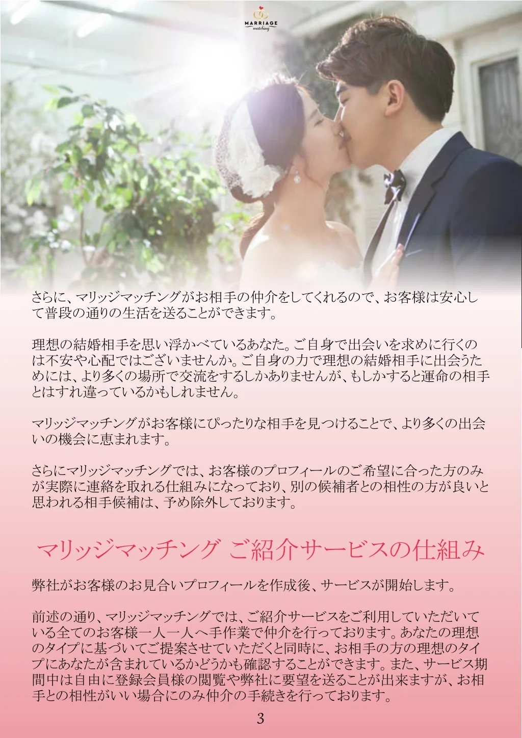 さらに、マリッジマッチングがお相手の仲介をしてくれるので、お客様は安心しさらに、マリッジマッチングがお相手の仲介をしてくれるので、お客様は安心し て普段の通りの生活を送ることができます。 理想の結婚相手を思い浮かべているあなた。ご自身で出会いを求めに行くの は不安や心配ではございませんか。ご自身の力で理想の結婚相手に出会うた めには、より多くの場所で交流をするしかありませんが、もしかすると運命の相手 とはすれ違っているかもしれません。 マリッジマッチングがお客様にぴったりな相手を見つけることで、より多くの出会 いの機会に恵まれます。 さらにマリッジマッチングでは、お客様のプロフィールのご希望に合った方のみ が実際に連絡を取れる仕組みになっており、別の候補者との相性の方が良いと 思われる相手候補は、予め除外しております。 マリッジマッチング ご紹介サービスの仕組み 弊社がお客様のお見合いプロフィールを作成後、サービスが開始します。 前述の通り、マリッジマッチングでは、ご紹介サービスをご利用していただいて いる全てのお客様一人一人へ手作業で仲介を行っております。あなたの理想 のタイプに基づいてご提案させていただくと同時に、お相手の方の理想のタイ プにあなたが含まれているかどうかも確認することができます。また、サービス期 間中は自由に登録会員様の閲覧や弊社に要望を送ることが出来ますが、お相 手との相性がいい場合にのみ仲介の手続きを行っております。 3