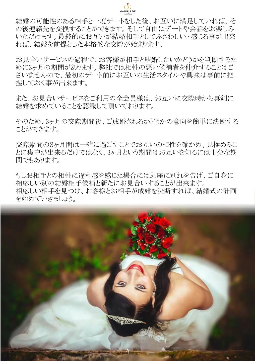 結婚の可能性のある相手と一度デートをした後、お互いに満足していれば、そ結婚の可能性のある相手と一度デートをした後、お互いに満足していれば、そ の後連絡先を交換することができます。そして自由にデートや会話をお楽しみ いただけます。最終的にお互いが結婚相手としてふさわしいと感じる事が出来 れば、結婚を前提とした本格的な交際が始まります。 お見合いサービスの過程で、お客様が相手と結婚したいかどうかを判断するた めに3ヶ月の期間があります。弊社では相性の悪い候補者を仲介することはご ざいませんので、最初のデート前にお互いの生活スタイルや興味は事前に把 握しておく事が出来ます。 また、お見合いサービスをご利用の全会員様は、お互いに交際時から真剣に 結婚を求めていることを認識して頂いております。 そのため、3ヶ月の交際期間後、ご成婚されるかどうかの意向を簡単に決断する ことができます。 交際期間の3ヶ月間は一緒に過ごすことでお互いの相性を確かめ、見極めるこ とに集中が出来るだけではなく、3ヶ月という期間はお互いを知るには十分な期 間でもあります。 もしお相手との相性に違和感を感じた場合には即座に別れを告げ、ご自身に 相応しい別の結婚相手候補と新たにお見合いすることが出来ます。 相応しい相手を見つけ、お客様とお相手が成婚を決断すれば、結婚式の計画 を始めていきましょう。 4
