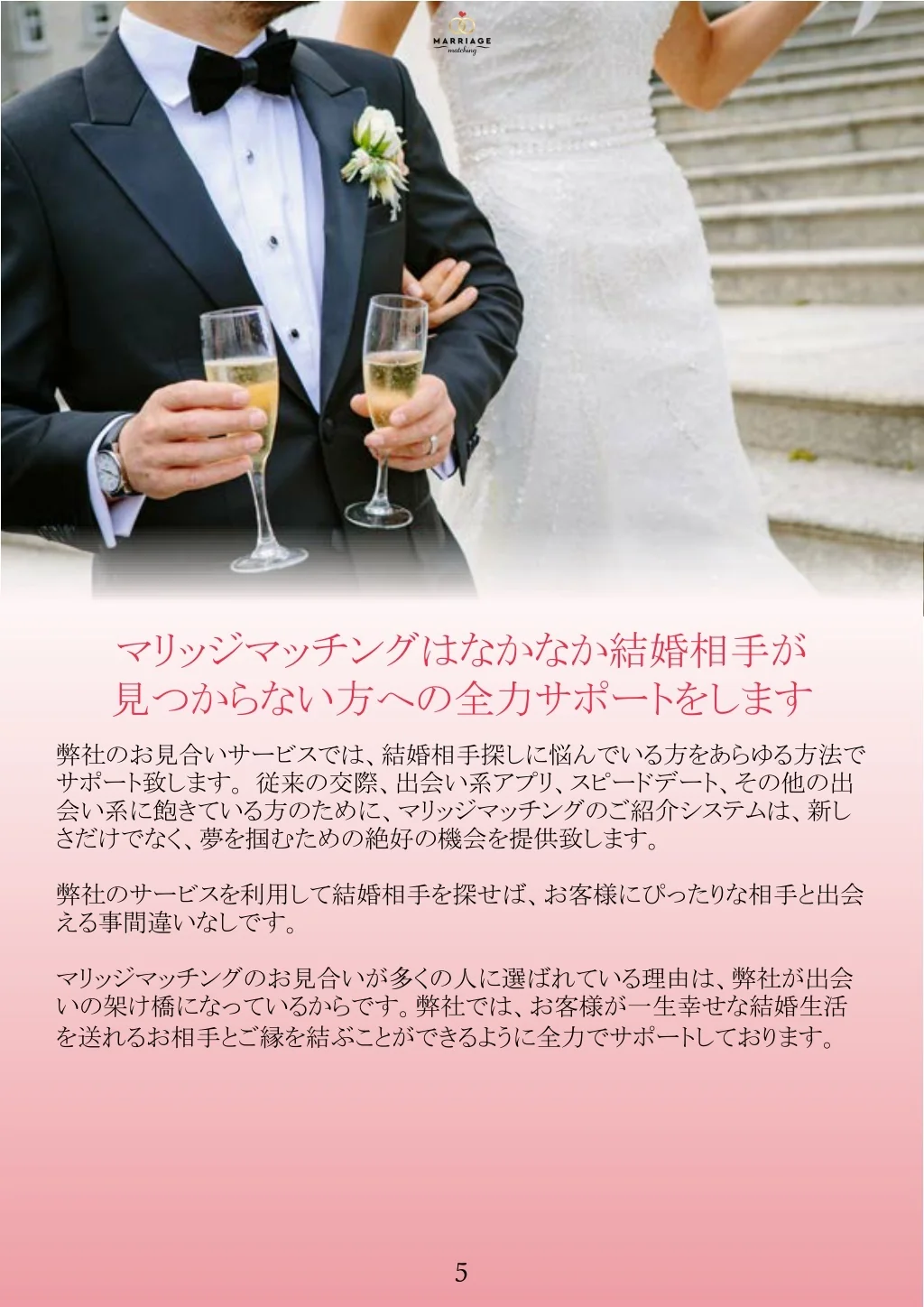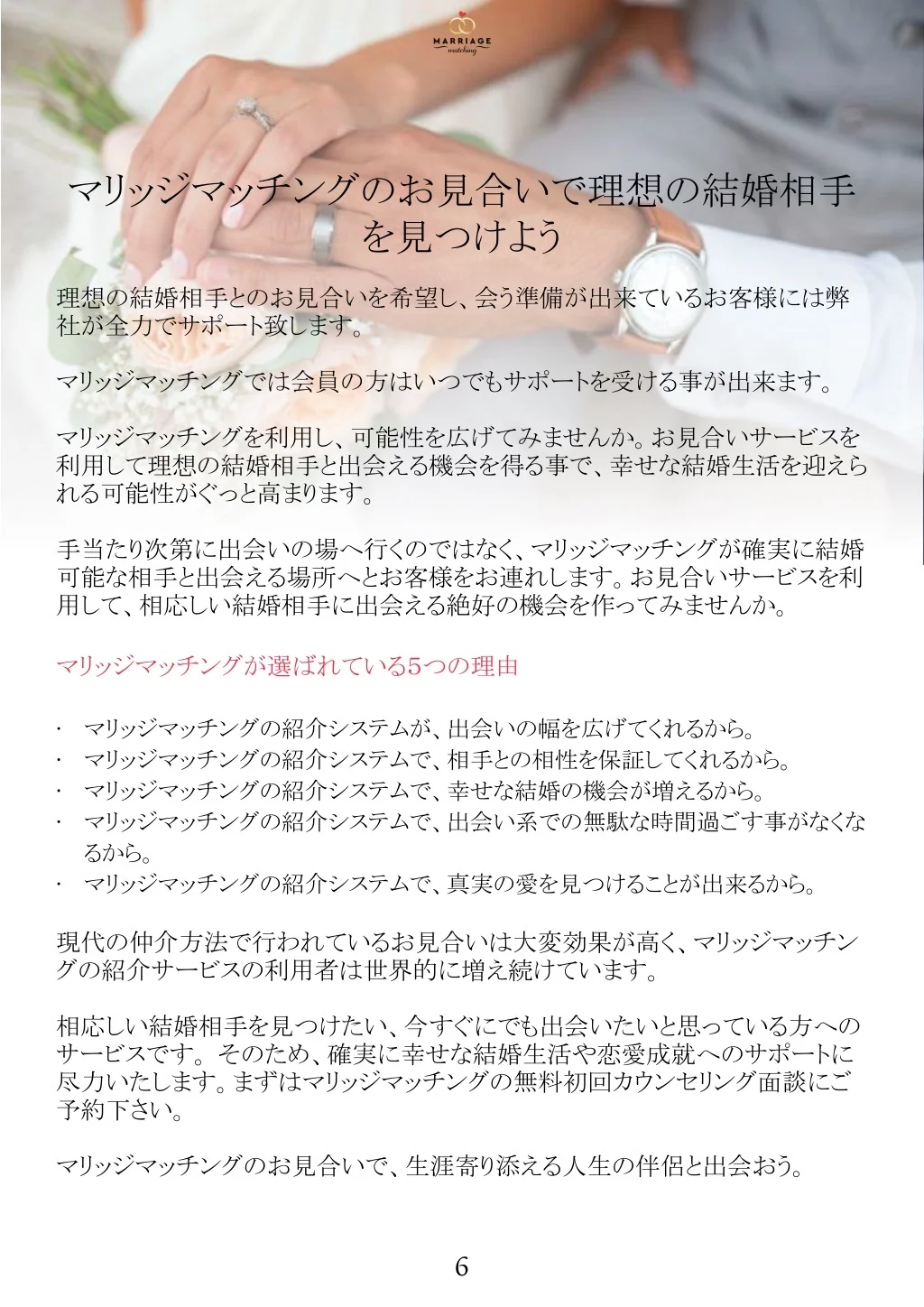 マリッジマッチングはなかなか結婚相手が 見つからない方への全力サポートをします 弊社のお見合いサービスでは、結婚相手探しに悩んでいる方をあらゆる方法で サポート致します。 従来の交際、出会い系アプリ、スピードデート、その他の出 会い系に飽きている方のために、マリッジマッチングのご紹介システムは、新し さだけでなく、夢を掴むための絶好の機会を提供致します。 弊社のサービスを利用して結婚相手を探せば、お客様にぴったりな相手と出会 える事間違いなしです。 マリッジマッチングのお見合いが多くの人に選ばれている理由は、弊社が出会 いの架け橋になっているからです。弊社では、お客様が一生幸せな結婚生活 を送れるお相手とご縁を結ぶことができるように全力でサポートしております。 5