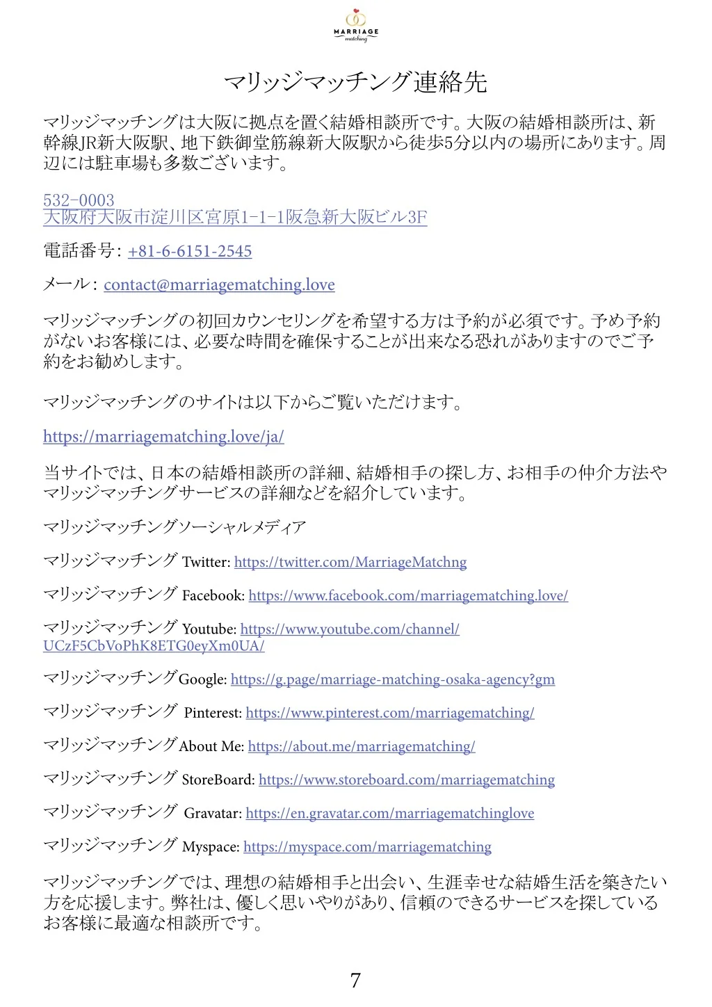 マリッジマッチング連絡先 マリッジマッチングは大阪に拠点を置く結婚相談所です。大阪の結婚相談所は、新 幹線JR新大阪駅、地下鉄御堂筋線新大阪駅から徒歩5分以内の場所にあります。周 辺には駐車場も多数ございます。 532-0003 大阪府大阪市淀川区宮原1-1-1阪急新大阪ビル3F 電話番号: +81-6-6151-2545 メール: contact@marriagematching.love マリッジマッチングの初回カウンセリングを希望する方は予約が必須です。予め予約 がないお客様には、必要な時間を確保することが出来なる恐れがありますのでご予 約をお勧めします。 マリッジマッチングのサイトは以下からご覧いただけます。 https://marriagematching.love/ja/ 当サイトでは、日本の結婚相談所の詳細、結婚相手の探し方、お相手の仲介方法や マリッジマッチングサービスの詳細などを紹介しています。 マリッジマッチングソーシャルメディア マリッジマッチング Twitter: https://twitter.com/MarriageMatchng マリッジマッチング Facebook: https://www.facebook.com/marriagematching.love/ マリッジマッチング Youtube: https://www.youtube.com/channel/ UCzF5CbVoPhK8ETG0eyXm0UA/ マリッジマッチングGoogle: https://g.page/marriage-matching-osaka-agency?gm マリッジマッチング Pinterest: https://www.pinterest.com/marriagematching/ マリッジマッチングAbout Me: https://about.me/marriagematching/ マリッジマッチング StoreBoard: https://www.storeboard.com/marriagematching マリッジマッチング Gravatar: https://en.gravatar.com/marriagematchinglove マリッジマッチング Myspace: https://myspace.com/marriagematching マリッジマッチングでは、理想の結婚相手と出会い、生涯幸せな結婚生活を築きたい 方を応援します。弊社は、優しく思いやりがあり、信頼のできるサービスを探している お客様に最適な相談所です。 7